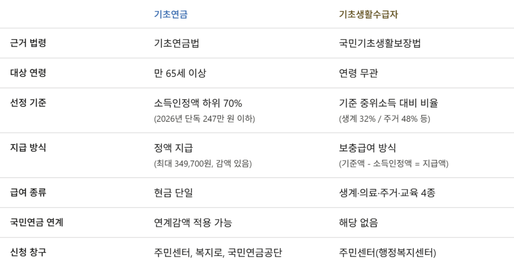 이 질문을 지인에게서 받았을 때 저도 한 번에 명확하게 답을 드리지 못했습니다. 이름도 비슷하고, 둘 다 저소득 어르신을 위한 제도라는 이미지가 강하다 보니, “두 개 중 하나만 선택해야 하는 것 아닌가?”라는 오해가 생각보다 굉장히 많습니다.