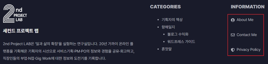 ‘소개’, ‘문의’, ‘개인정보처리방침’을 메뉴에 추가하고, 헤더에 노출되도록 설정합니다.